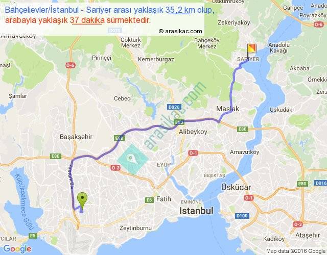 Bahçelievler İstanbul - Sariyer arası yaklaşık olarak 90 km/h ile yukarıda belirtilen sürede olup, iki yerin kuş uçuşu uzaklığı (mesafesi) 25'dir. Yolculuk otobüsle 48 dakika sürmektedir.