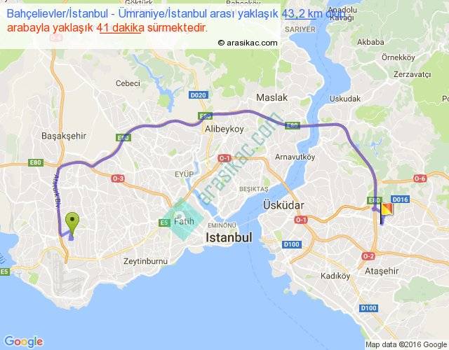 Bahçelievler İstanbul - Ümraniye İstanbul arası yaklaşık olarak 90 km/h ile yukarıda belirtilen sürede olup, iki yerin kuş uçuşu uzaklığı (mesafesi) 25'dir. Yolculuk otobüsle 53 dakika sürmektedir.