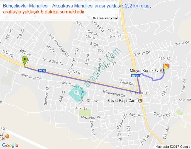 Bahçelievler Mahallesi - Akçakaya Mahallesi arası yaklaşık olarak 90 km/h ile yukarıda belirtilen sürede olup, iki yerin kuş uçuşu uzaklığı (mesafesi) 2'dir. Yolculuk otobüsle 6 dakika sürmektedir.