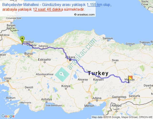 Bahçelievler Mahallesi - Gündüzbey arası yaklaşık olarak 90 km/h ile yukarıda belirtilen sürede olup, iki yerin kuş uçuşu uzaklığı (mesafesi) 885'dir. Eğer belirtilen yerler arasında uçak seferi var ise bu süre uçakla 1 saat 21 dakika'ya kadar düşebilir. Yolculuk otobüsle 16 saat 35 dakika sürmektedir.
