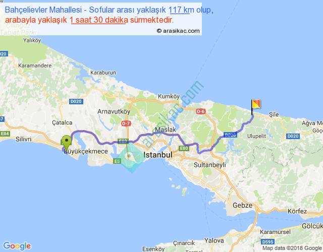 Bahçelievler Mahallesi - Sofular arası yaklaşık olarak 90 km/h ile yukarıda belirtilen sürede olup, iki yerin kuş uçuşu uzaklığı (mesafesi) 86'dir. Yolculuk otobüsle 1 saat 57 dakika sürmektedir.