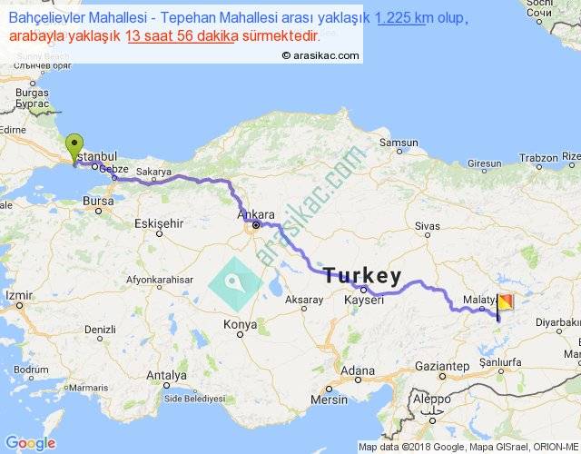 Bahçelievler Mahallesi - Tepehan Mahallesi arası yaklaşık olarak 90 km/h ile yukarıda belirtilen sürede olup, iki yerin kuş uçuşu uzaklığı (mesafesi) 930'dir. Eğer belirtilen yerler arasında uçak seferi var ise bu süre uçakla 1 saat 25 dakika'ya kadar düşebilir. Yolculuk otobüsle 18 saat 6 dakika sürmektedir.
