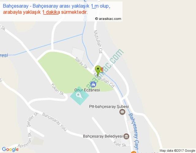 Bahçesaray - Bahçesaray arası yaklaşık olarak 90 km/h ile yukarıda belirtilen sürede olup, iki yerin kuş uçuşu uzaklığı (mesafesi) 0'dir. Yolculuk otobüsle 1 dakika sürmektedir.