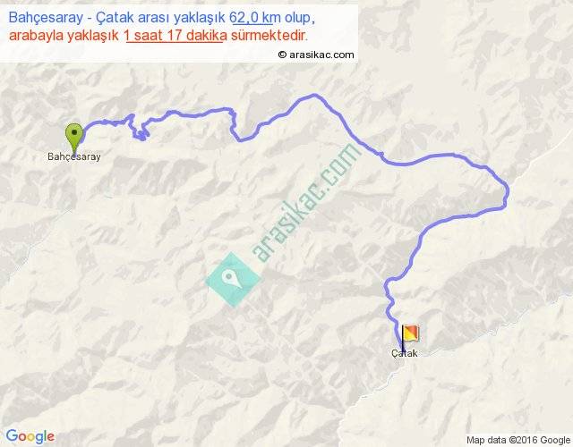 Bahçesaray - Çatak arası yaklaşık olarak 90 km/h ile yukarıda belirtilen sürede olup, iki yerin kuş uçuşu uzaklığı (mesafesi) 26'dir. Yolculuk otobüsle 1 saat 40 dakika sürmektedir.
