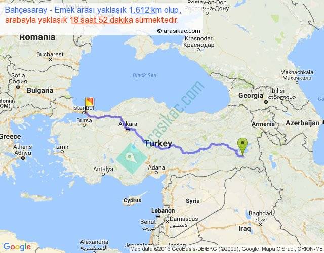 Bahçesaray - Emek arası yaklaşık olarak 90 km/h ile yukarıda belirtilen sürede olup, iki yerin kuş uçuşu uzaklığı (mesafesi) 1201'dir. Eğer belirtilen yerler arasında uçak seferi var ise bu süre uçakla 1 saat 50 dakika'ya kadar düşebilir. Yolculuk otobüsle 1 gün 0 saat sürmektedir.