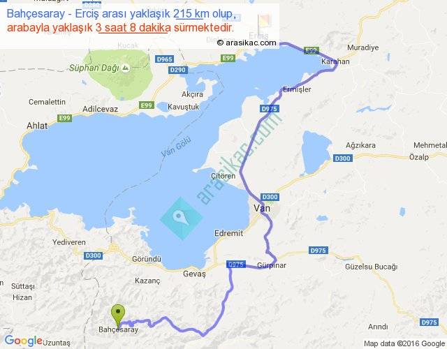 Bahçesaray - Erciş arası yaklaşık olarak 90 km/h ile yukarıda belirtilen sürede olup, iki yerin kuş uçuşu uzaklığı (mesafesi) 111'dir. Yolculuk otobüsle 4 saat 4 dakika sürmektedir.
