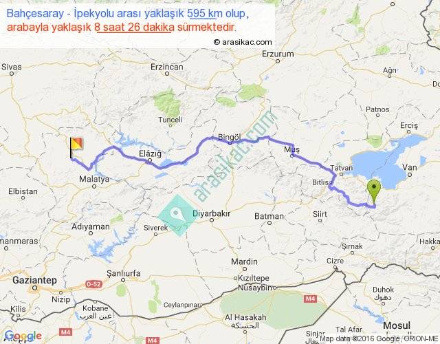 Bahçesaray - İpekyolu arası yaklaşık olarak 90 km/h ile yukarıda belirtilen sürede olup, iki yerin kuş uçuşu uzaklığı (mesafesi) 424'dir. Eğer belirtilen yerler arasında uçak seferi var ise bu süre uçakla 39 dakika'ya kadar düşebilir. Yolculuk otobüsle 10 saat 57 dakika sürmektedir.