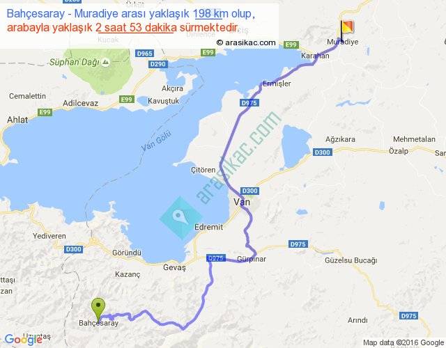 Bahçesaray - Muradiye arası yaklaşık olarak 90 km/h ile yukarıda belirtilen sürede olup, iki yerin kuş uçuşu uzaklığı (mesafesi) 127'dir. Yolculuk otobüsle 3 saat 44 dakika sürmektedir.