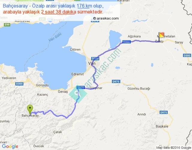 Bahçesaray - Özalp arası yaklaşık olarak 90 km/h ile yukarıda belirtilen sürede olup, iki yerin kuş uçuşu uzaklığı (mesafesi) 118'dir. Yolculuk otobüsle 3 saat 25 dakika sürmektedir.