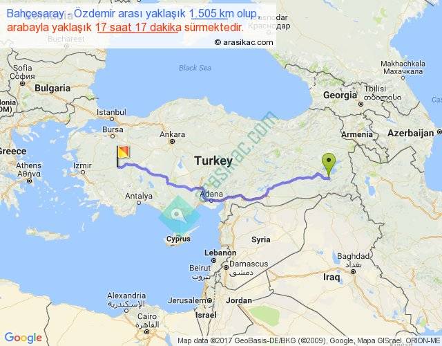 Bahçesaray - Özdemir arası yaklaşık olarak 90 km/h ile yukarıda belirtilen sürede olup, iki yerin kuş uçuşu uzaklığı (mesafesi) 1162'dir. Eğer belirtilen yerler arasında uçak seferi var ise bu süre uçakla 1 saat 47 dakika'ya kadar düşebilir. Yolculuk otobüsle 22 saat 28 dakika sürmektedir.
