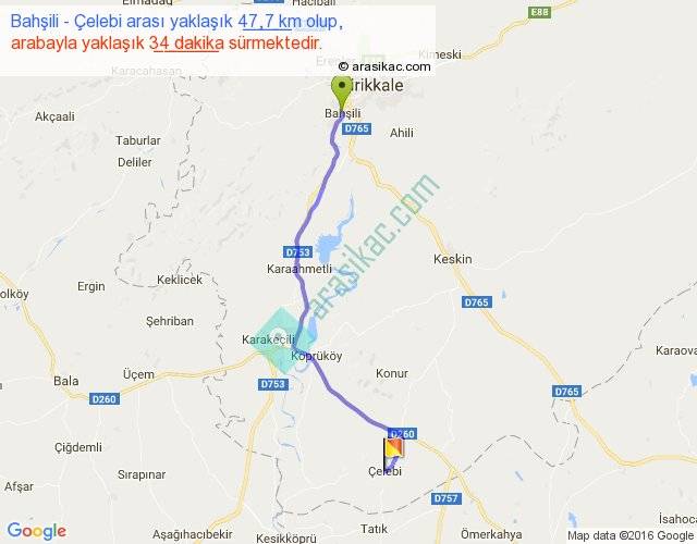 Bahşili - Çelebi arası yaklaşık olarak 90 km/h ile yukarıda belirtilen sürede olup, iki yerin kuş uçuşu uzaklığı (mesafesi) 39'dir. Yolculuk otobüsle 44 dakika sürmektedir.