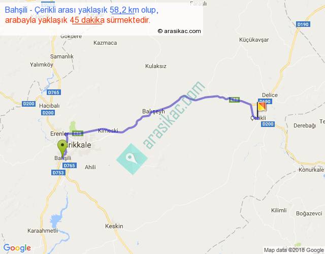 Bahşili - Çerikli arası yaklaşık olarak 90 km/h ile yukarıda belirtilen sürede olup, iki yerin kuş uçuşu uzaklığı (mesafesi) 46'dir. Yolculuk otobüsle 58 dakika sürmektedir.