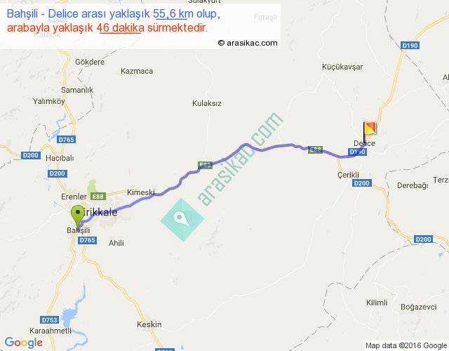 Bahşili - Delice arası yaklaşık olarak 90 km/h ile yukarıda belirtilen sürede olup, iki yerin kuş uçuşu uzaklığı (mesafesi) 50'dir. Yolculuk otobüsle 59 dakika sürmektedir.