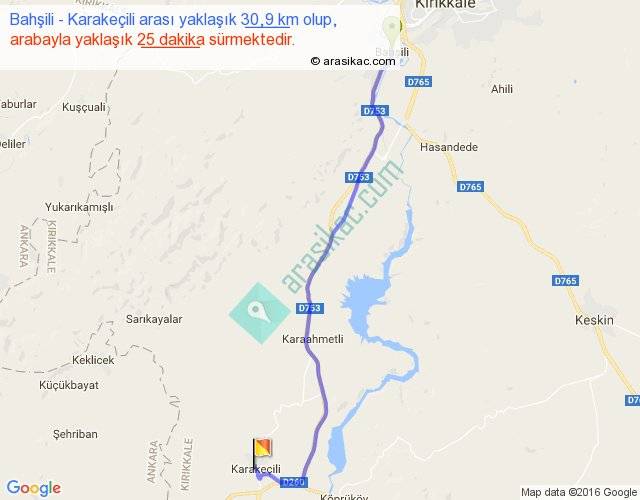 Bahşili - Karakeçili arası yaklaşık olarak 90 km/h ile yukarıda belirtilen sürede olup, iki yerin kuş uçuşu uzaklığı (mesafesi) 26'dir. Yolculuk otobüsle 32 dakika sürmektedir.