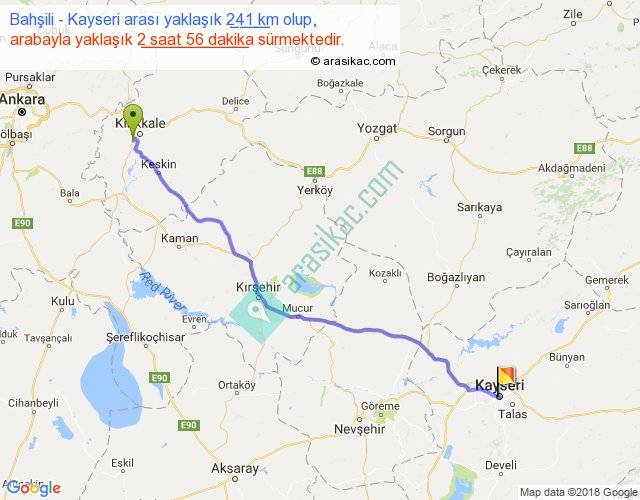 Bahşili - Kayseri arası yaklaşık olarak 90 km/h ile yukarıda belirtilen sürede olup, iki yerin kuş uçuşu uzaklığı (mesafesi) 210'dir. Yolculuk otobüsle 3 saat 48 dakika sürmektedir.