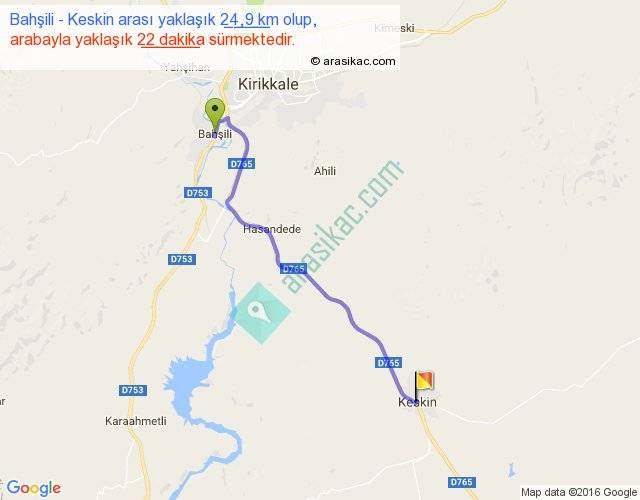 Bahşili - Keskin arası yaklaşık olarak 90 km/h ile yukarıda belirtilen sürede olup, iki yerin kuş uçuşu uzaklığı (mesafesi) 20'dir. Yolculuk otobüsle 28 dakika sürmektedir.