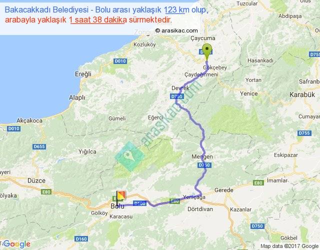 Bakacakkadı Belediyesi - Bolu arası yaklaşık olarak 90 km/h ile yukarıda belirtilen sürede olup, iki yerin kuş uçuşu uzaklığı (mesafesi) 78'dir. Yolculuk otobüsle 2 saat 7 dakika sürmektedir.