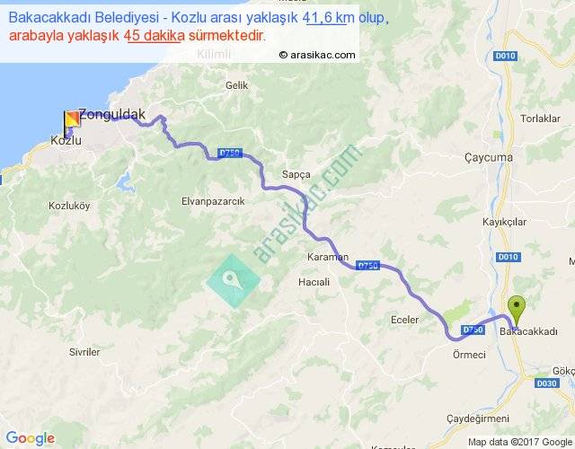 Bakacakkadı Belediyesi - Kozlu arası yaklaşık olarak 90 km/h ile yukarıda belirtilen sürede olup, iki yerin kuş uçuşu uzaklığı (mesafesi) 31'dir. Yolculuk otobüsle 58 dakika sürmektedir.
