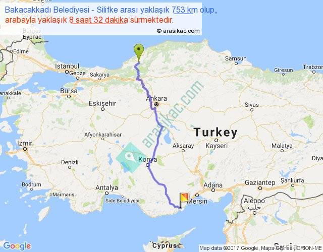 Bakacakkadı Belediyesi - Silifke arası yaklaşık olarak 90 km/h ile yukarıda belirtilen sürede olup, iki yerin kuş uçuşu uzaklığı (mesafesi) 570'dir. Eğer belirtilen yerler arasında uçak seferi var ise bu süre uçakla 52 dakika'ya kadar düşebilir. Yolculuk otobüsle 11 saat 5 dakika sürmektedir.