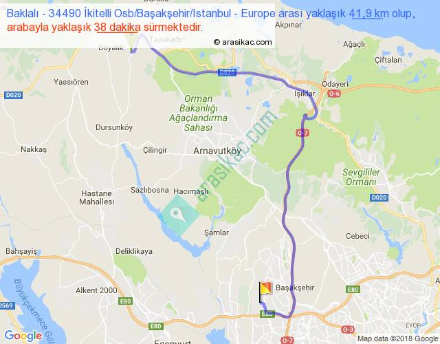 Baklalı - 34490 İkitelli Osb Başakşehir Istanbul - Europe arası yaklaşık olarak 90 km/h ile yukarıda belirtilen sürede olup, iki yerin kuş uçuşu uzaklığı (mesafesi) 23'dir. Yolculuk otobüsle 49 dakika sürmektedir.