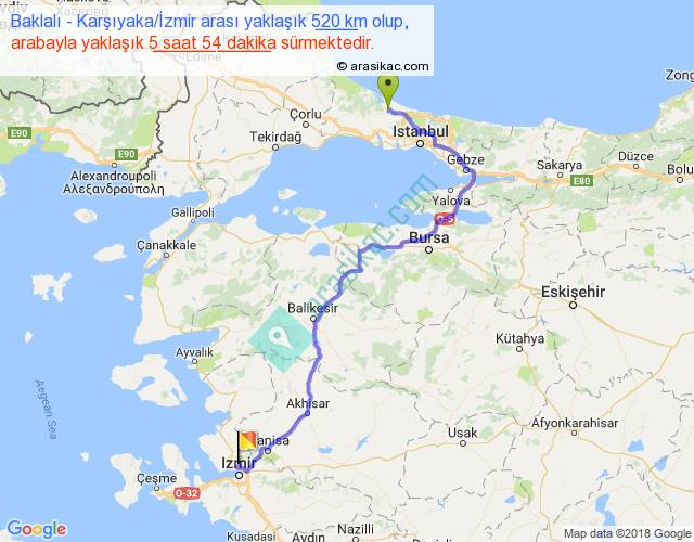 Baklalı - Karşıyaka İzmir arası yaklaşık olarak 90 km/h ile yukarıda belirtilen sürede olup, iki yerin kuş uçuşu uzaklığı (mesafesi) 330'dir. Eğer belirtilen yerler arasında uçak seferi var ise bu süre uçakla 30 dakika'ya kadar düşebilir. Yolculuk otobüsle 7 saat 40 dakika sürmektedir.
