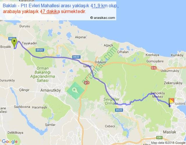 Baklalı - Ptt Evleri Mahallesi arası yaklaşık olarak 90 km/h ile yukarıda belirtilen sürede olup, iki yerin kuş uçuşu uzaklığı (mesafesi) 33'dir. Yolculuk otobüsle 1 saat 1 dakika sürmektedir.