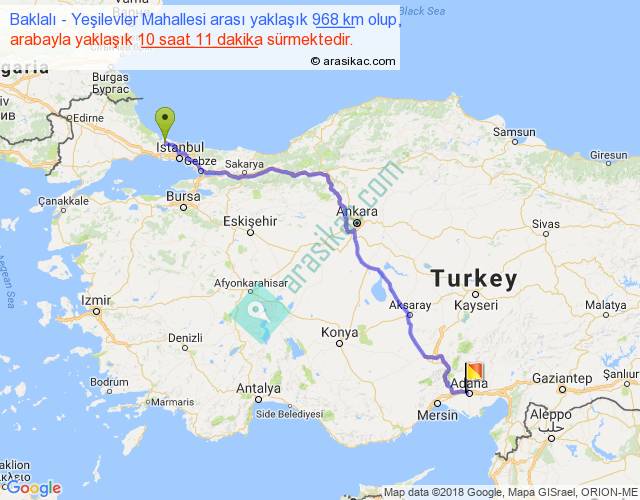 Baklalı - Yeşilevler Mahallesi arası yaklaşık olarak 90 km/h ile yukarıda belirtilen sürede olup, iki yerin kuş uçuşu uzaklığı (mesafesi) 738'dir. Eğer belirtilen yerler arasında uçak seferi var ise bu süre uçakla 1 saat 08 dakika'ya kadar düşebilir. Yolculuk otobüsle 13 saat 14 dakika sürmektedir.
