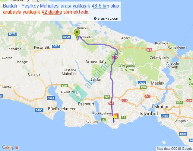 Baklalı - Yeşilköy Mahallesi arası yaklaşık olarak 90 km/h ile yukarıda belirtilen sürede olup, iki yerin kuş uçuşu uzaklığı (mesafesi) 34'dir. Yolculuk otobüsle 54 dakika sürmektedir.