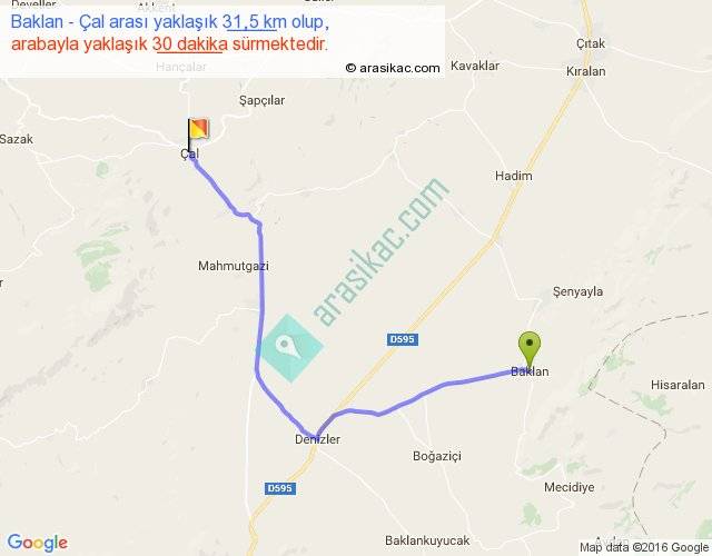 Baklan - Çal arası yaklaşık olarak 90 km/h ile yukarıda belirtilen sürede olup, iki yerin kuş uçuşu uzaklığı (mesafesi) 22'dir. Yolculuk otobüsle 39 dakika sürmektedir.
