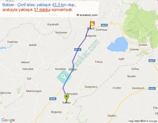 Baklan - Çivril arası yaklaşık olarak 90 km/h ile yukarıda belirtilen sürede olup, iki yerin kuş uçuşu uzaklığı (mesafesi) 38'dir. Yolculuk otobüsle 48 dakika sürmektedir.