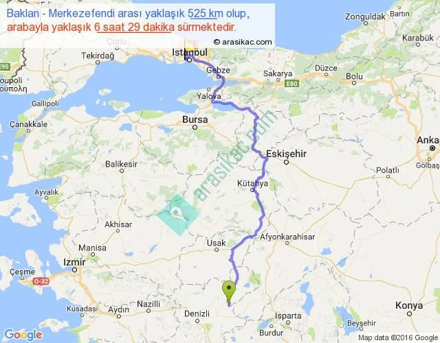 Baklan - Merkezefendi arası yaklaşık olarak 90 km/h ile yukarıda belirtilen sürede olup, iki yerin kuş uçuşu uzaklığı (mesafesi) 341'dir. Eğer belirtilen yerler arasında uçak seferi var ise bu süre uçakla 31 dakika'ya kadar düşebilir. Yolculuk otobüsle 8 saat 25 dakika sürmektedir.