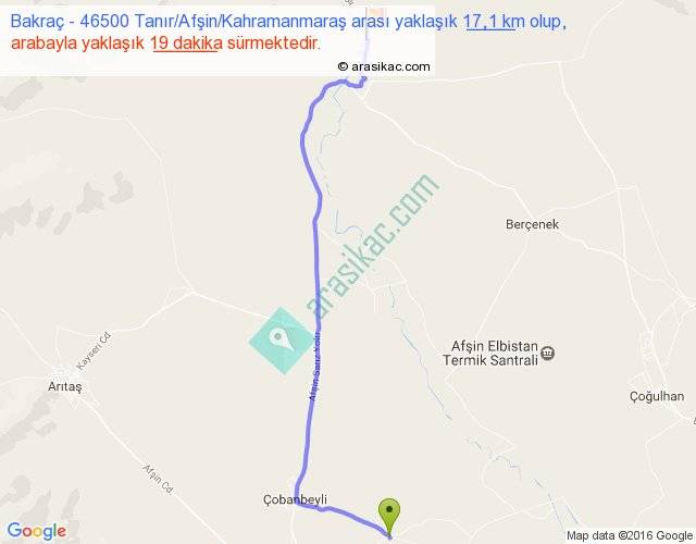 Bakraç - 46500 Tanır Afşin Kahramanmaraş arası yaklaşık olarak 90 km/h ile yukarıda belirtilen sürede olup, iki yerin kuş uçuşu uzaklığı (mesafesi) 14'dir. Yolculuk otobüsle 24 dakika sürmektedir.