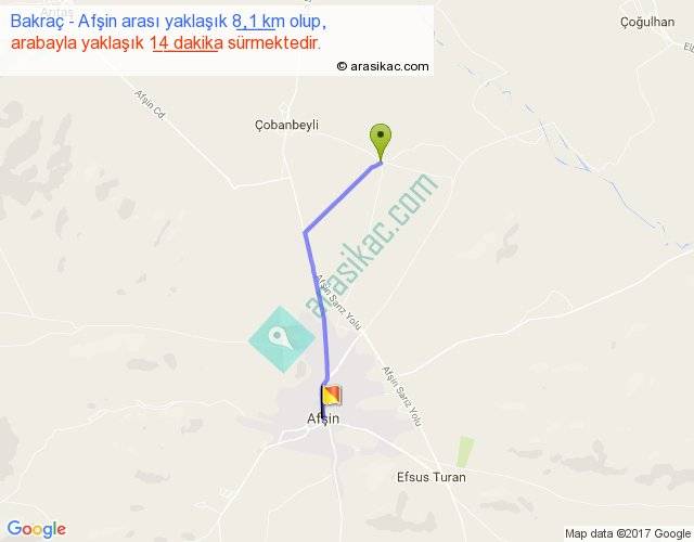 Bakraç - Afşin arası yaklaşık olarak 90 km/h ile yukarıda belirtilen sürede olup, iki yerin kuş uçuşu uzaklığı (mesafesi) 7'dir. Yolculuk otobüsle 18 dakika sürmektedir.