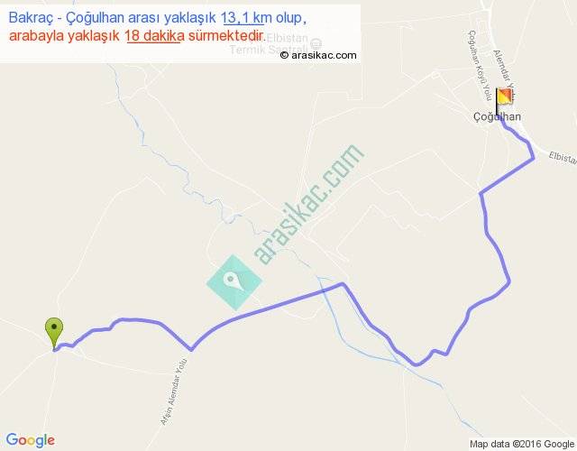 Bakraç - Çoğulhan arası yaklaşık olarak 90 km/h ile yukarıda belirtilen sürede olup, iki yerin kuş uçuşu uzaklığı (mesafesi) 8'dir. Yolculuk otobüsle 23 dakika sürmektedir.