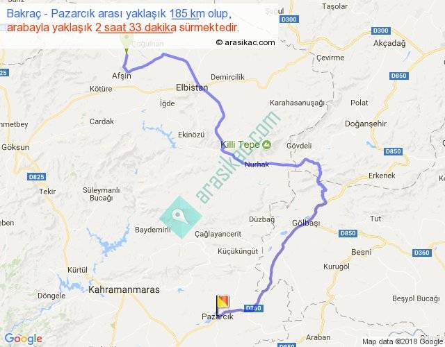 Bakraç - Pazarcık arası yaklaşık olarak 90 km/h ile yukarıda belirtilen sürede olup, iki yerin kuş uçuşu uzaklığı (mesafesi) 96'dir. Yolculuk otobüsle 3 saat 18 dakika sürmektedir.