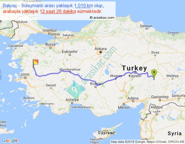Bakraç - Süleymanlı arası yaklaşık olarak 90 km/h ile yukarıda belirtilen sürede olup, iki yerin kuş uçuşu uzaklığı (mesafesi) 794'dir. Eğer belirtilen yerler arasında uçak seferi var ise bu süre uçakla 1 saat 13 dakika'ya kadar düşebilir. Yolculuk otobüsle 16 saat 9 dakika sürmektedir.