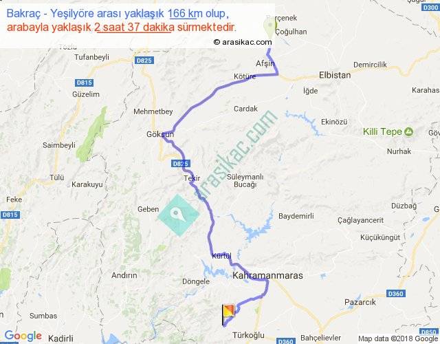 Bakraç - Yeşilyöre arası yaklaşık olarak 90 km/h ile yukarıda belirtilen sürede olup, iki yerin kuş uçuşu uzaklığı (mesafesi) 100'dir. Yolculuk otobüsle 3 saat 24 dakika sürmektedir.