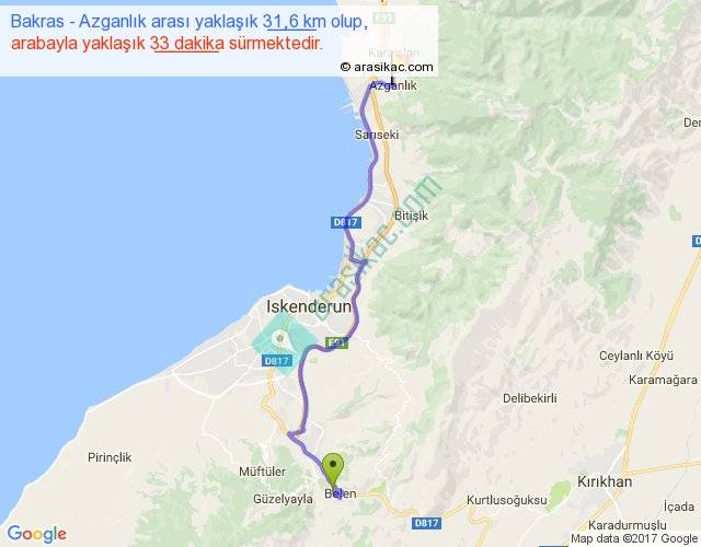 Bakras - Azganlık arası yaklaşık olarak 90 km/h ile yukarıda belirtilen sürede olup, iki yerin kuş uçuşu uzaklığı (mesafesi) 23'dir. Yolculuk otobüsle 42 dakika sürmektedir.