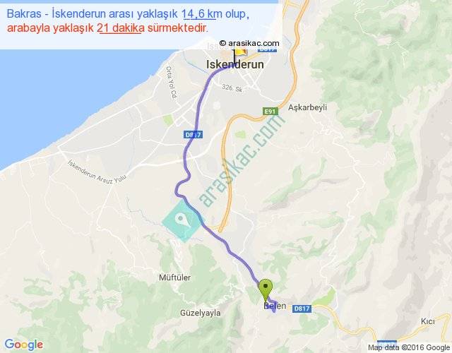 Bakras - İskenderun arası yaklaşık olarak 90 km/h ile yukarıda belirtilen sürede olup, iki yerin kuş uçuşu uzaklığı (mesafesi) 10'dir. Yolculuk otobüsle 27 dakika sürmektedir.