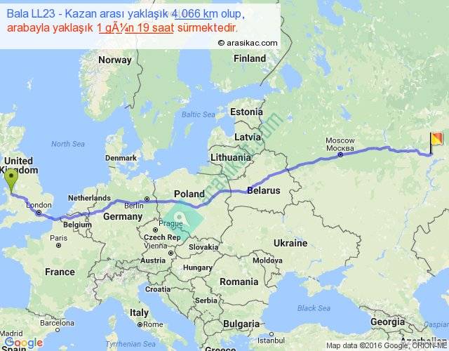Bala LL23 - Kazan arası yaklaşık olarak 90 km/h ile yukarıda belirtilen sürede olup, iki yerin kuş uçuşu uzaklığı (mesafesi) 3324'dir. Eğer belirtilen yerler arasında uçak seferi var ise bu süre uçakla 5 saat 06 dakika'ya kadar düşebilir. Yolculuk otobüsle 2 gün 7 saat sürmektedir.