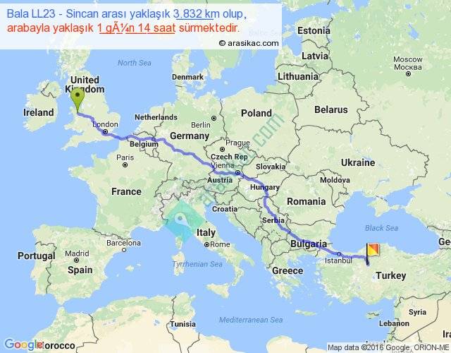 Bala LL23 - Sincan arası yaklaşık olarak 90 km/h ile yukarıda belirtilen sürede olup, iki yerin kuş uçuşu uzaklığı (mesafesi) 3061'dir. Eğer belirtilen yerler arasında uçak seferi var ise bu süre uçakla 4 saat 42 dakika'ya kadar düşebilir. Yolculuk otobüsle 2 gün 1 saat sürmektedir.