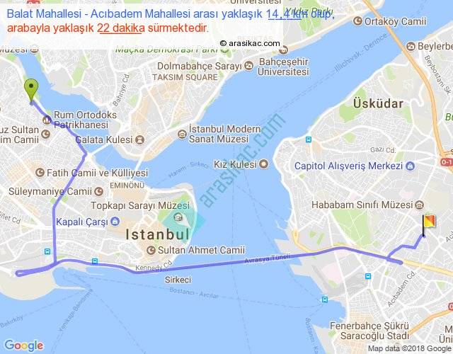 Balat Mahallesi - Acıbadem Mahallesi arası yaklaşık olarak 90 km/h ile yukarıda belirtilen sürede olup, iki yerin kuş uçuşu uzaklığı (mesafesi) 8'dir. Yolculuk otobüsle 28 dakika sürmektedir.