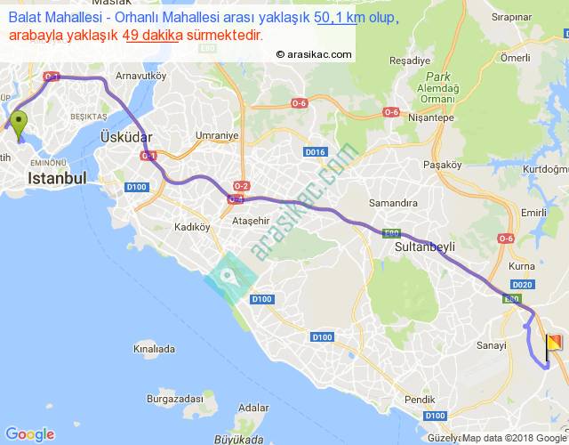 Balat Mahallesi - Orhanlı Mahallesi arası yaklaşık olarak 90 km/h ile yukarıda belirtilen sürede olup, iki yerin kuş uçuşu uzaklığı (mesafesi) 37'dir. Yolculuk otobüsle 1 saat 3 dakika sürmektedir.