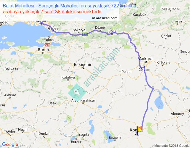 Balat Mahallesi - Saraçoğlu Mahallesi arası yaklaşık olarak 90 km/h ile yukarıda belirtilen sürede olup, iki yerin kuş uçuşu uzaklığı (mesafesi) 470'dir. Eğer belirtilen yerler arasında uçak seferi var ise bu süre uçakla 43 dakika'ya kadar düşebilir. Yolculuk otobüsle 9 saat 55 dakika sürmektedir.