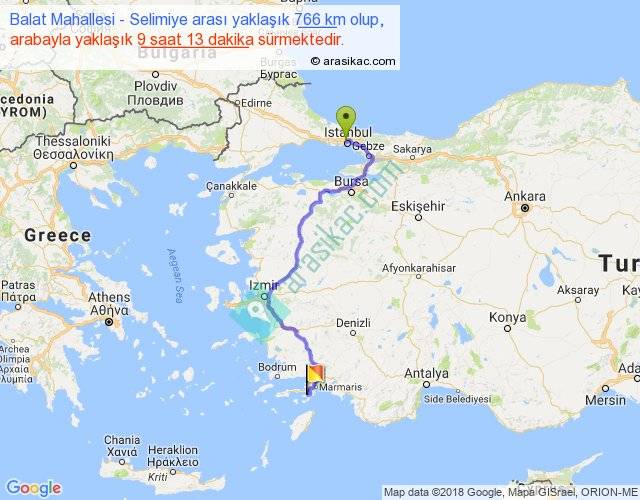 Balat Mahallesi - Selimiye arası yaklaşık olarak 90 km/h ile yukarıda belirtilen sürede olup, iki yerin kuş uçuşu uzaklığı (mesafesi) 484'dir. Eğer belirtilen yerler arasında uçak seferi var ise bu süre uçakla 44 dakika'ya kadar düşebilir. Yolculuk otobüsle 11 saat 58 dakika sürmektedir.