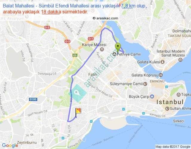 Balat Mahallesi - Sümbül Efendi Mahallesi arası yaklaşık olarak 90 km/h ile yukarıda belirtilen sürede olup, iki yerin kuş uçuşu uzaklığı (mesafesi) 4'dir. Yolculuk otobüsle 23 dakika sürmektedir.
