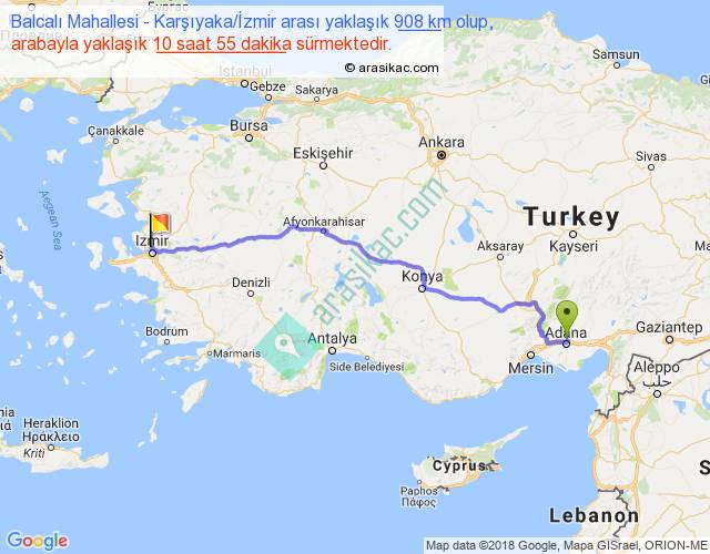 Balcalı Mahallesi - Karşıyaka İzmir arası yaklaşık olarak 90 km/h ile yukarıda belirtilen sürede olup, iki yerin kuş uçuşu uzaklığı (mesafesi) 735'dir. Eğer belirtilen yerler arasında uçak seferi var ise bu süre uçakla 1 saat 07 dakika'ya kadar düşebilir. Yolculuk otobüsle 14 saat 11 dakika sürmektedir.