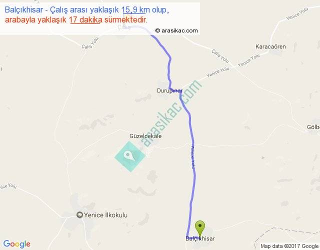 Balçıkhisar - Çalış arası yaklaşık olarak 90 km/h ile yukarıda belirtilen sürede olup, iki yerin kuş uçuşu uzaklığı (mesafesi) 13'dir. Yolculuk otobüsle 22 dakika sürmektedir.