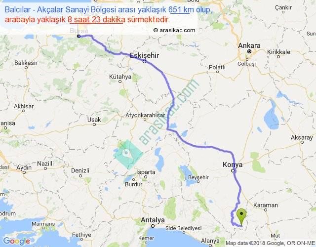 Balcılar - Akçalar Sanayi Bölgesi arası yaklaşık olarak 90 km/h ile yukarıda belirtilen sürede olup, iki yerin kuş uçuşu uzaklığı (mesafesi) 480'dir. Eğer belirtilen yerler arasında uçak seferi var ise bu süre uçakla 44 dakika'ya kadar düşebilir. Yolculuk otobüsle 10 saat 53 dakika sürmektedir.