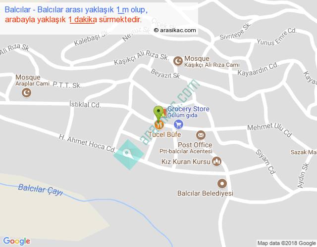 Balcılar - Balcılar arası yaklaşık olarak 90 km/h ile yukarıda belirtilen sürede olup, iki yerin kuş uçuşu uzaklığı (mesafesi) 0'dir. Yolculuk otobüsle 1 dakika sürmektedir.